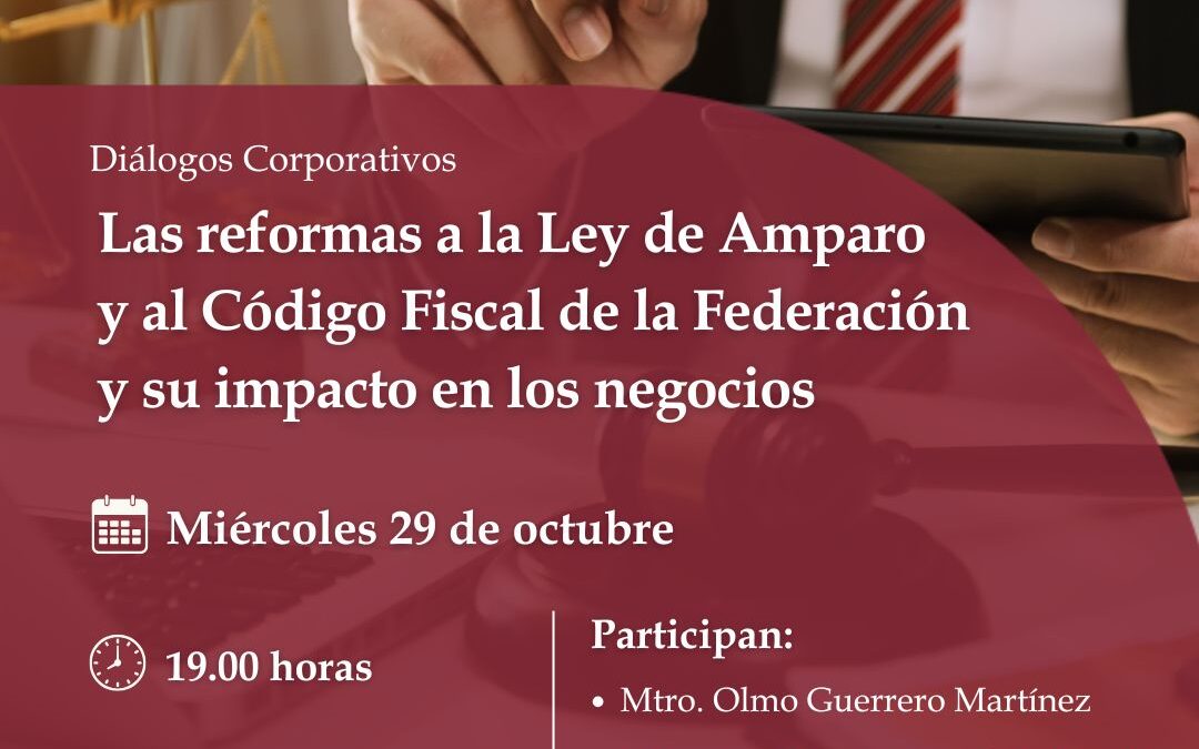 La Facultad Libre de Derecho de Monterrey te invita a participar a su sesión de Diálogos Corporativos. Las reformas a la Ley de Amparo y al Código Fiscal de la Federación y su impacto en los negocios.